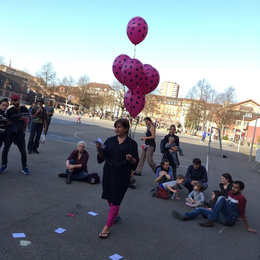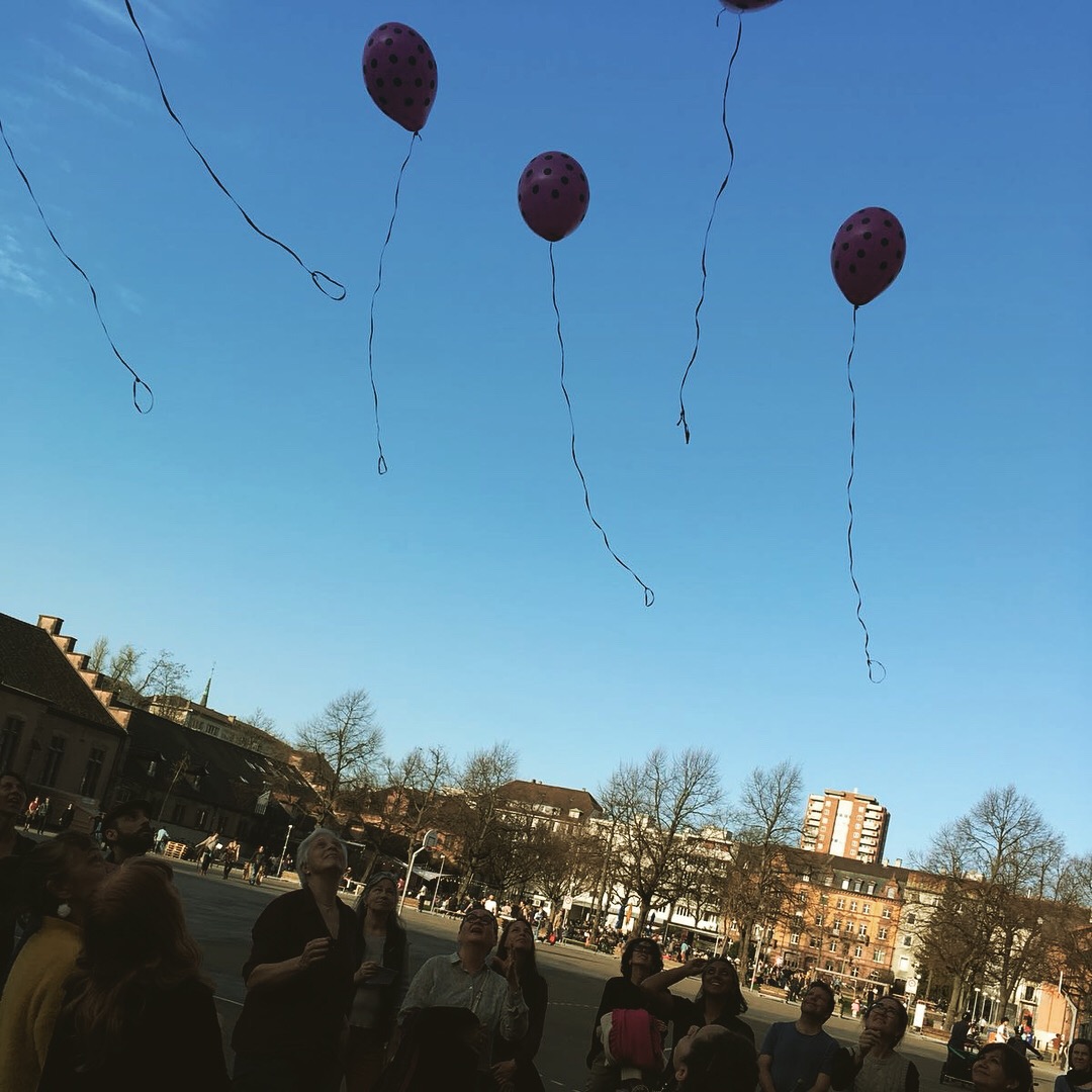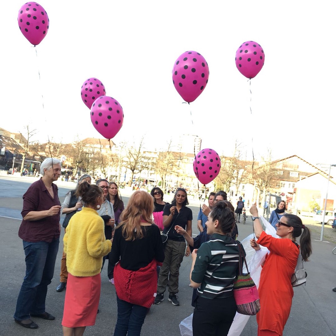 I read the text below in parts and on small pieces of paper that I threw on the floor after reading them, one by one and standing in front of the Ausstellungsraum Klingental, surrounded by the audience. In one hand I held pink balloons with black dots. When I had finished reading the whole text, I asked the audience to take a balloon and, together with me, let them fly, as a metaphor to liberate every woman but also as a memento for all those women who have been killed because of being women. ©Text by me.