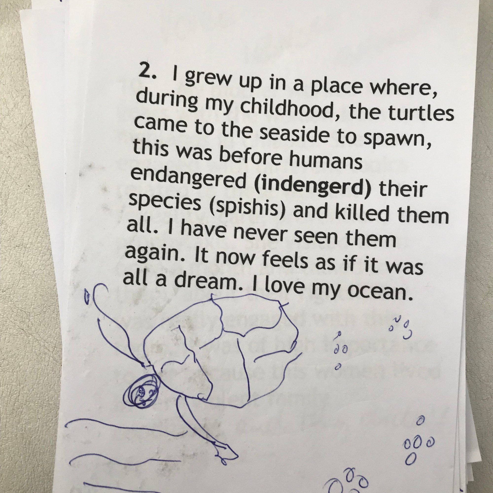 “I grew up in a place where, during my childhood, the turtles came to the seaside to spawn, this was before humans endangered their species and killed them all. I have never seen them again. It now feels as if it was all a dream. I love my ocean.”