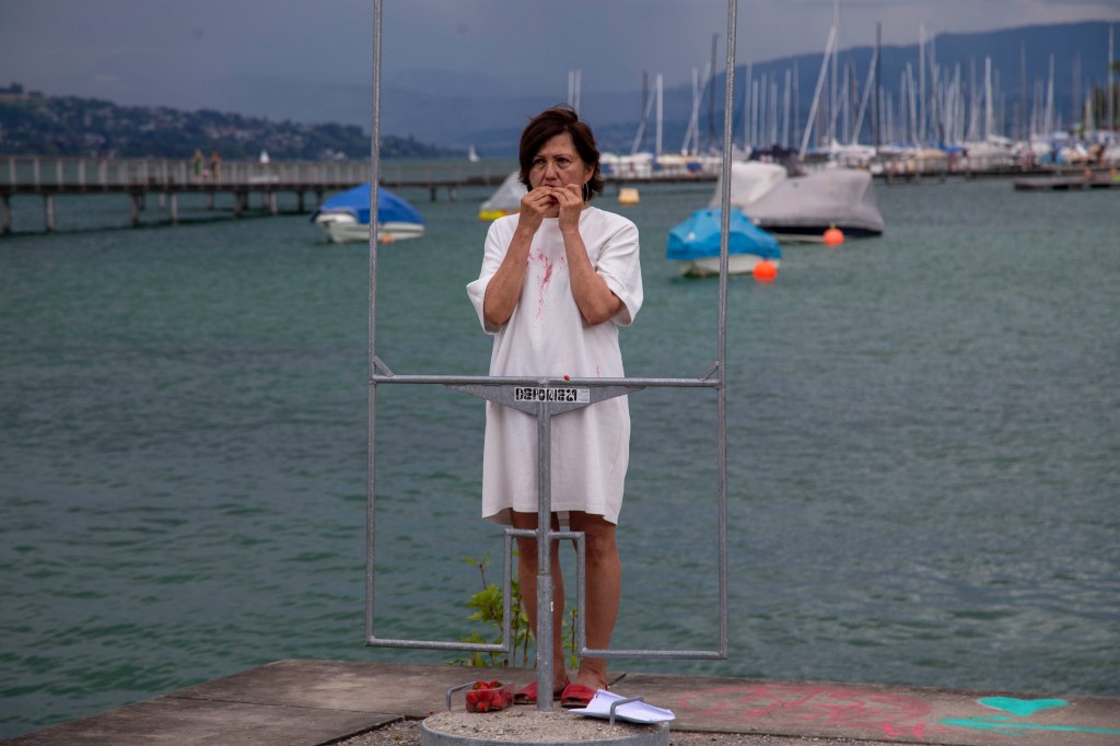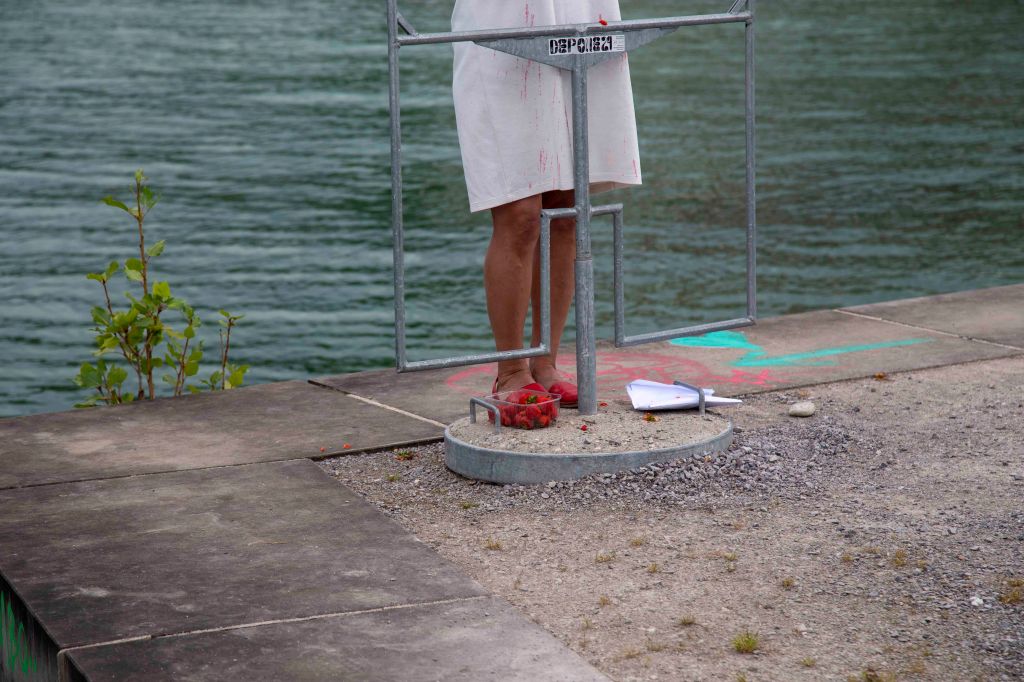 Ich stehe vor den Zuschauern. Hinter mir liegt der See. Ich beginne, die mitgebrachten Erdbeeren zu essen und sie so lange zu zerdrücken, bis der Saft in mein Kleid läuft und mich rot färbt.r